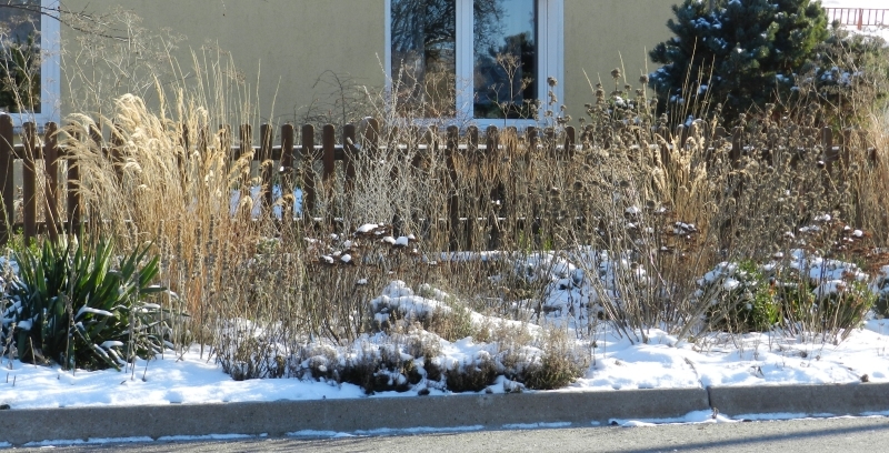 Ihn hatte ich hauptsächlich mit sehr trockenheitsverträglichen Stauden bepflanzt, weil Süden und aufheizende Mauer im Rücken. Aber das Nachbardach versorgt ihn so gut mit Regenwasser, dass die Trockenheitsfanatiker im wahrsten Sinne des Wortes ersaufen. Auch hier will ich im Laufe des Jahres bisschen umräumen.